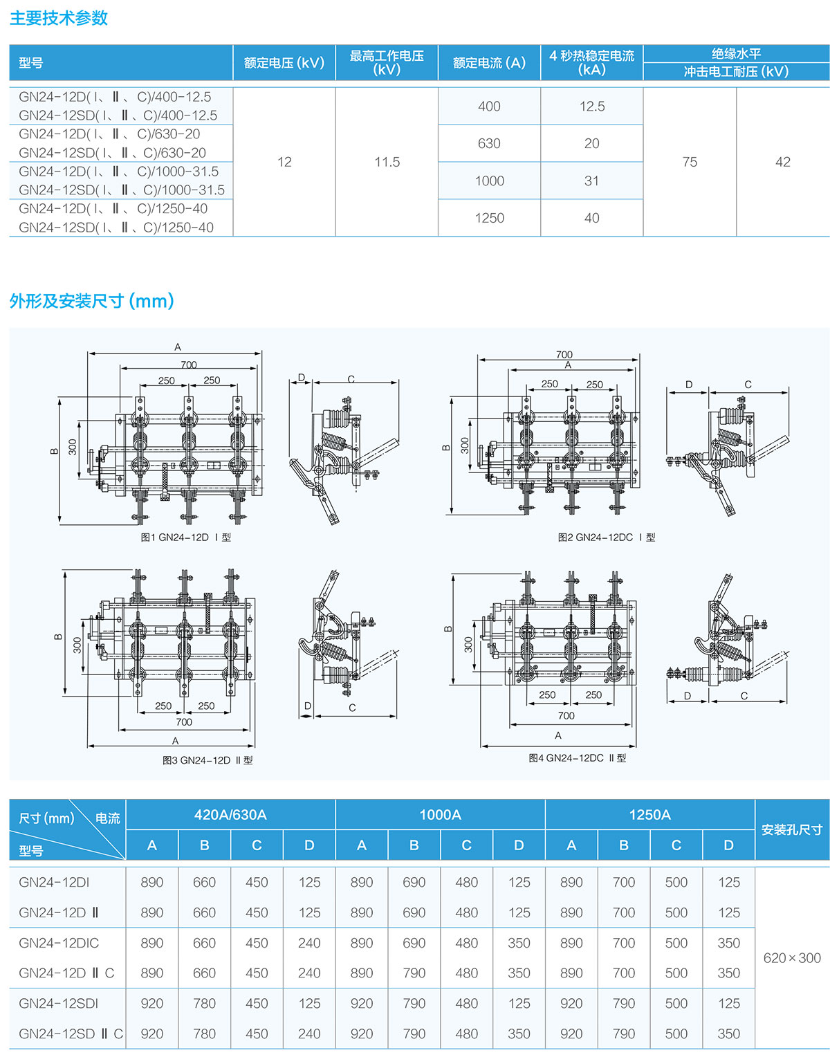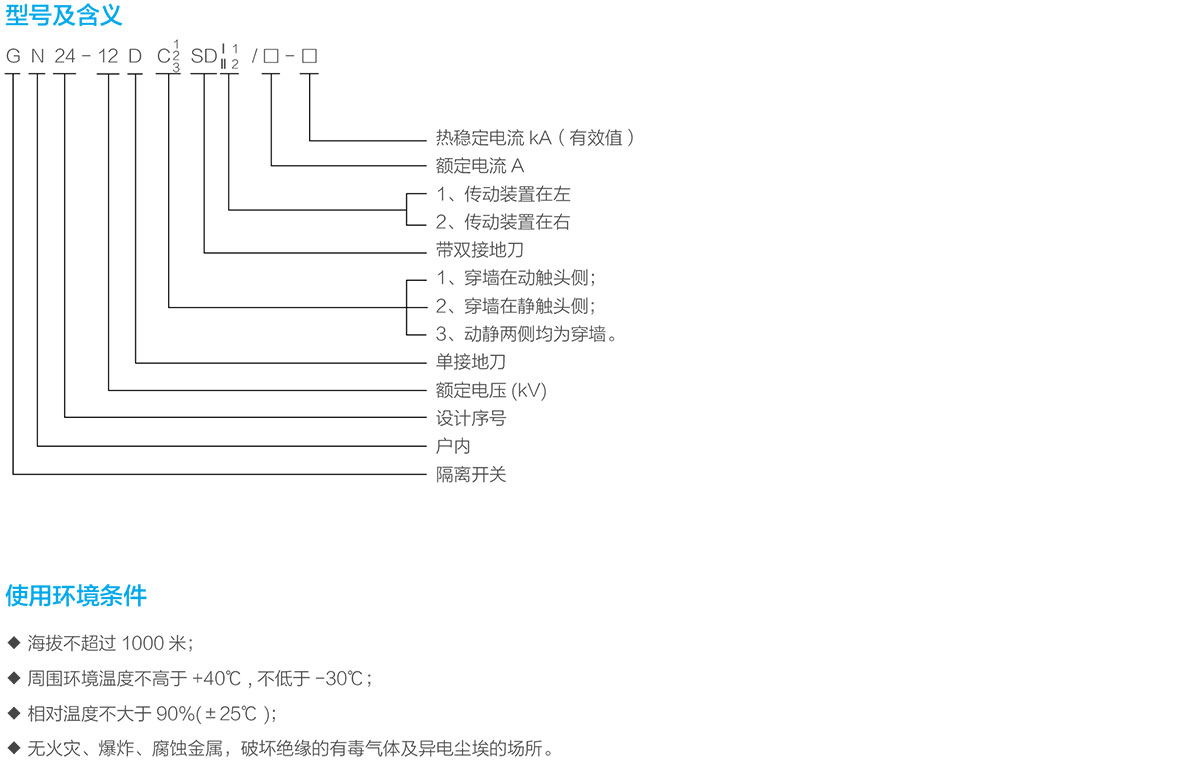 GN24—12D(C)(Ⅰ、Ⅱ)系列户内高压隔离开关(以下简称隔离开关) 为额定电压10KV、三相交流50Hz的网络中,作为在有电压而无负载 的情况下,分、合电路和接地之用。